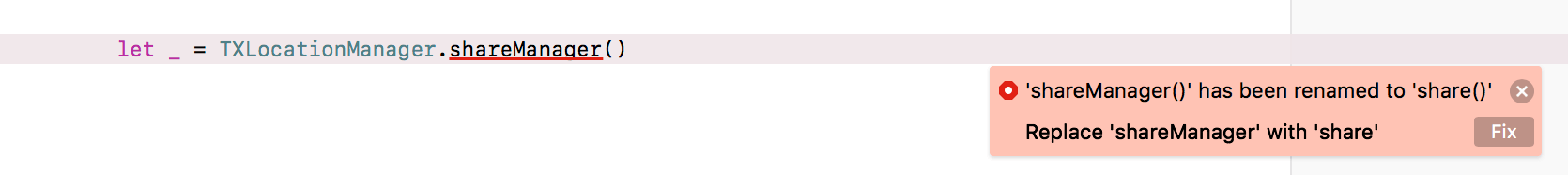 我们可以发现在 Swift 中引用时,shareManager 方法名被重命名为 share :